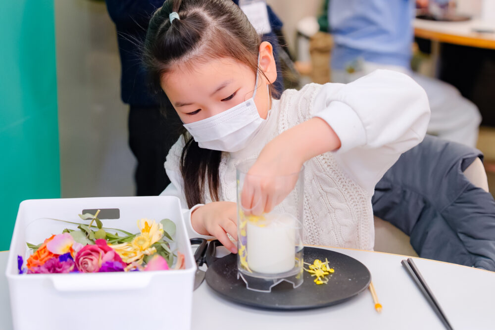 “アクション1”となった東京でのワークショップでは、子どもたちが能登の今を学び、ソニー・ミュージックエンタテインメントと日本サステナブルフラワー協会が推進する「Rebloom Flower Project」の一環として、4社がそれぞれ主催するライブ公演で回収した祝い花を活用したキャンドルづくりを実施した。